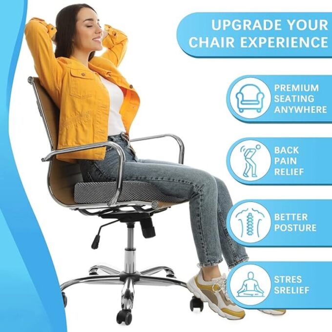 Múltiples usos: las almohadillas de la silla apoyan la recuperación de problemas de la columna vertebral como problemas de espalda baja, hernia de disco, lesiones de cóccix, ciática, etc. Tamaño grande (18.5 x 14.6 x 3.2 pulgadas) se adapta a todo tipo de sillas, ideal para oficina, sillas de escritorio en casa, asientos de automóvil, sillas de juegos, scooters de movilidad, asientos de automóvil y sillas de ruedas. También es adecuado para viajes y eventos deportivos.
