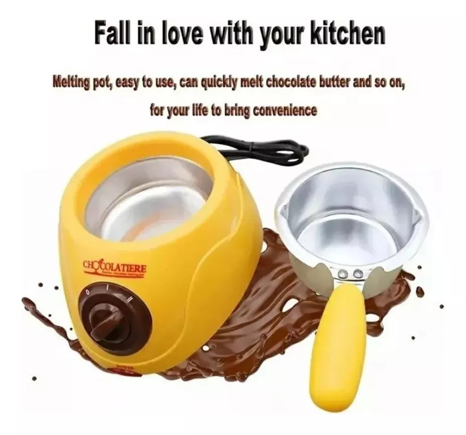 Su estructura portátil y ligera permite ubicarla fácilmente en la mesa, buffet o cocina. Gracias a su olla antiadherente y su sistema de calentamiento uniforme, garantiza que el chocolate se funda suavemente, sin grumos ni quemaduras.