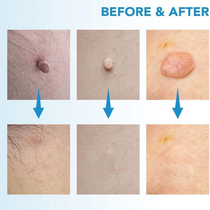 El dispositivo de eliminación funciona bloqueando el flujo de sangre a las verrugas de la piel, que se derraman en unos días. Funciona sin cicatrices, sin sensación.