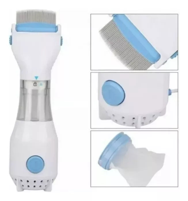 Este equipo integrado combina funciones de peinado y aspiración para eliminar eficazmente los piojos y las larvas sin el uso de productos químicos. Al peinar, elimina los piojos y las liendres del cabello y los almacena en el filtro interno. El cepillador de dientes está fabricado en acero inoxidable con puntas redondeadas y ofrece dos ángulos ajustables para peinar.