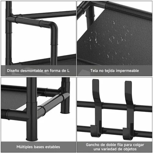 Fabricado en tubos metálicos resistentes y conectores plásticos reforzados. Soporta buen peso y es fácil de montar sin herramientas profesionales.