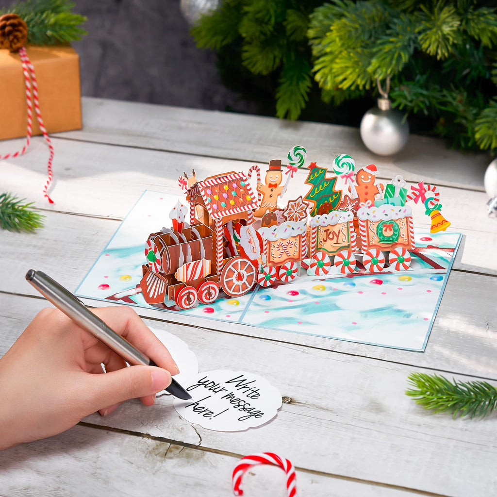 - Disfruta de la encantadora escena de un tren de jengibre lleno de alegría navideña. Santa Claus, un hombre de jengibre y golosinas festivas como bastones de caramelo y galletas cobran vida en este diseño 3D. El deseo de "Feliz Navidad" en la portada marca el tono para un alegre saludo navideño.