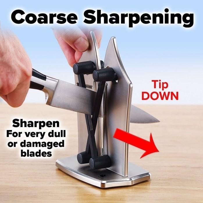 El afilador cuenta con dos brazos elásticos independientes fabricados con aleación de tungsteno y carbono, diseñados para adaptarse a cualquier tipo de cuchilla. Esta tecnología asegura un afilado uniforme y eficaz, incluso para cuchillos dentados, devolviéndoles la capacidad de realizar cortes precisos y sin esfuerzo.