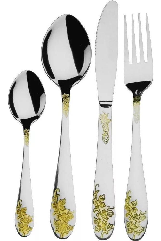 Dale un toque sofisticado y elegante a tu mesa con el Juego de Cubiertos Zepter de 24 piezas, ideal para 6 puestos completos. Su diseño moderno con detalles dorados combina perfectamente con cualquier vajilla, elevando la presentación de tus comidas diarias y ocasiones especiales.