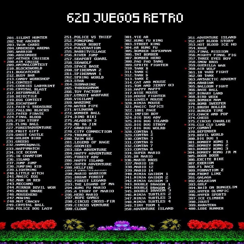 La consola viene preinstalada con 620 videojuegos retro, listos para jugar.