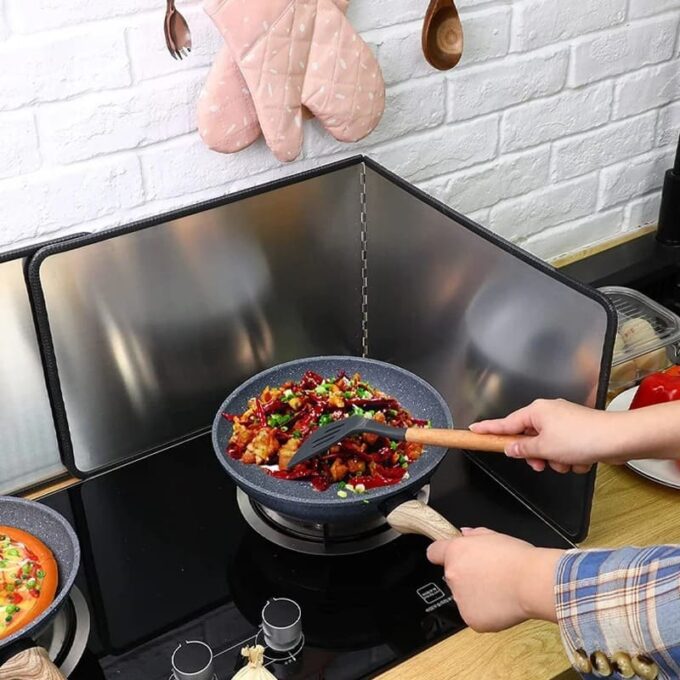 - El protector contra salpicaduras de cocina bloquea eficazmente las salpicaduras de aceite en la cocina, y el efecto de aislamiento térmico es bueno, evitando que la pared de la estufa se cubra con aceite.