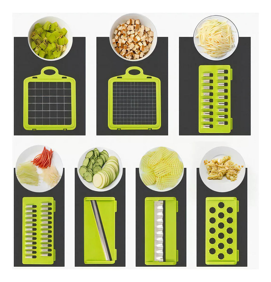 Cuenta con 7 cuchillas intercambiables de acero inoxidable ultra afilado para cortar, rallar o picar con precisión. Desde rodajas perfectas hasta cubos uniformes, podrás preparar todo tipo de ingredientes sin necesidad de múltiples herramientas. Es el aliado ideal para reducir tiempo en la cocina y elevar la presentación de tus platos.