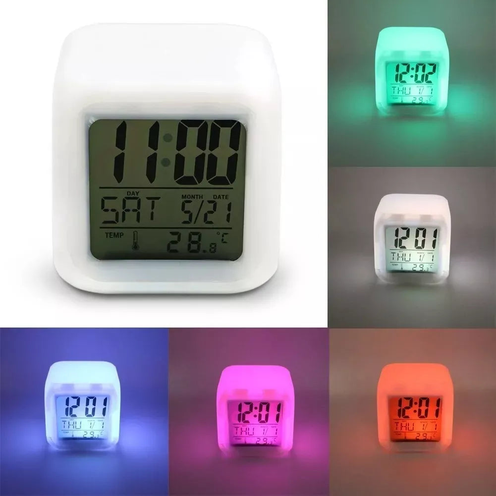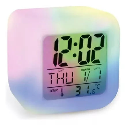 Este reloj tiene luces LED que giran entre siete colores vibrantes. No es solo bonito, es funcional: te ayuda a relajarte, decorar el cuarto o usarlo como luz de noche sin que te encandile. Ideal para personas que aman los ambientes suaves y modernos.