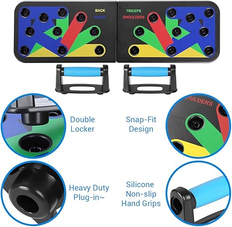 Calidad prémium: la tabla pushup está hecha de plástico ABS dúctil que hace que el material sea muy estudiado con alta resistencia a impactos y temperatura. Diseño plegable, asas antideslizantes que encajan perfectamente en la tabla y asas de transporte integradas para que sea más fácil y cómodo de transportar.